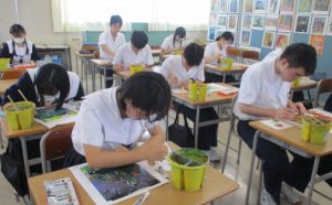 1年「人物クロッキー」 クラスの代表者をモデルとして,人物クロッキーに取り組んでいます。ポーズを工夫した友達をじっくり観察し,特徴を写し取ろうと頑張っています。 2年「風景画」 水彩画,アクリル画,パステル画の中から […]